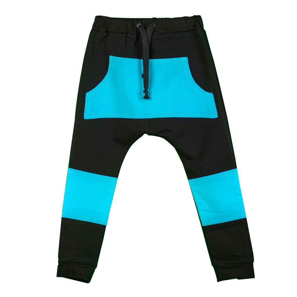Chlapecké černé tepláčky baggy s tyrkysovou