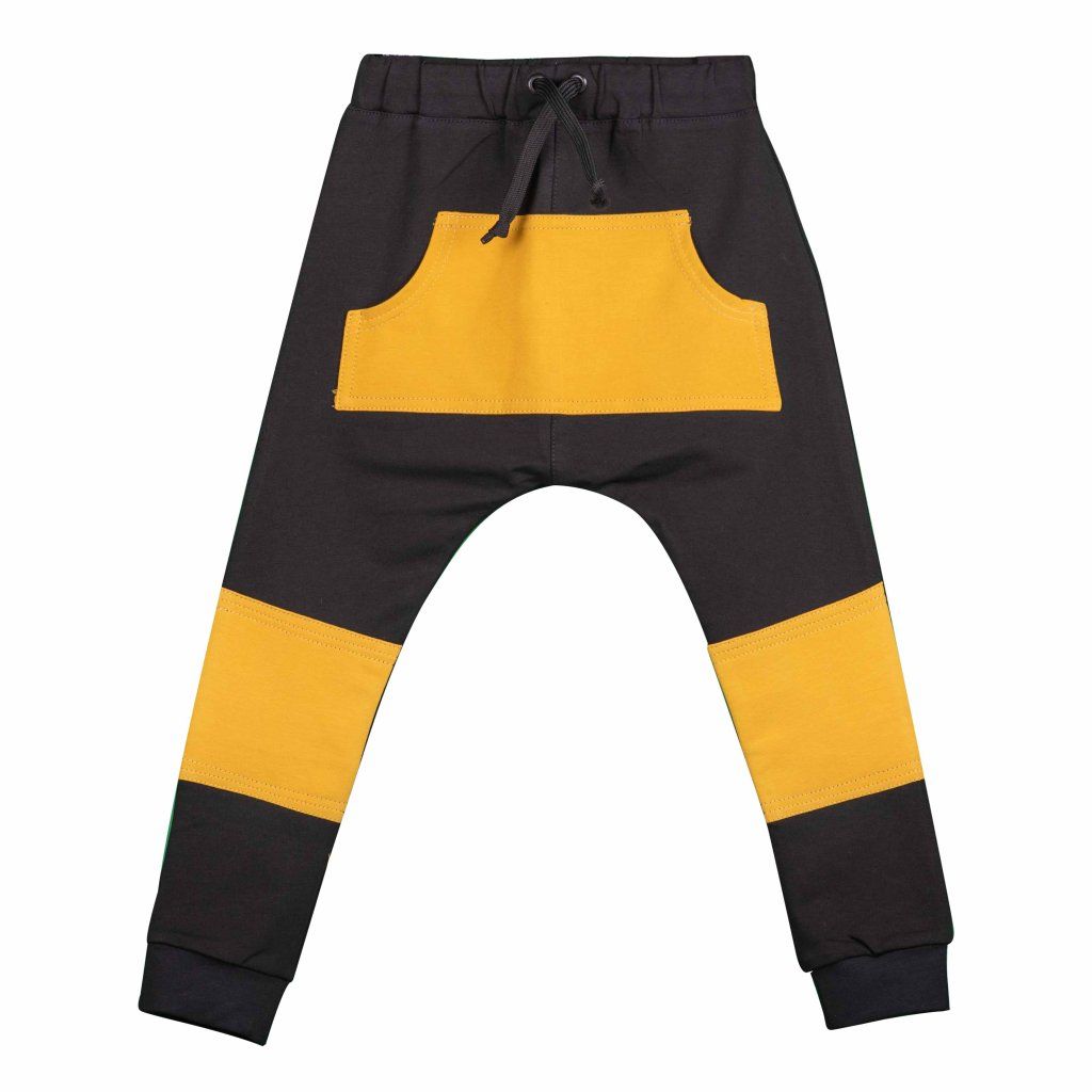 Dětské černé tepláčky baggy s hořčicovou