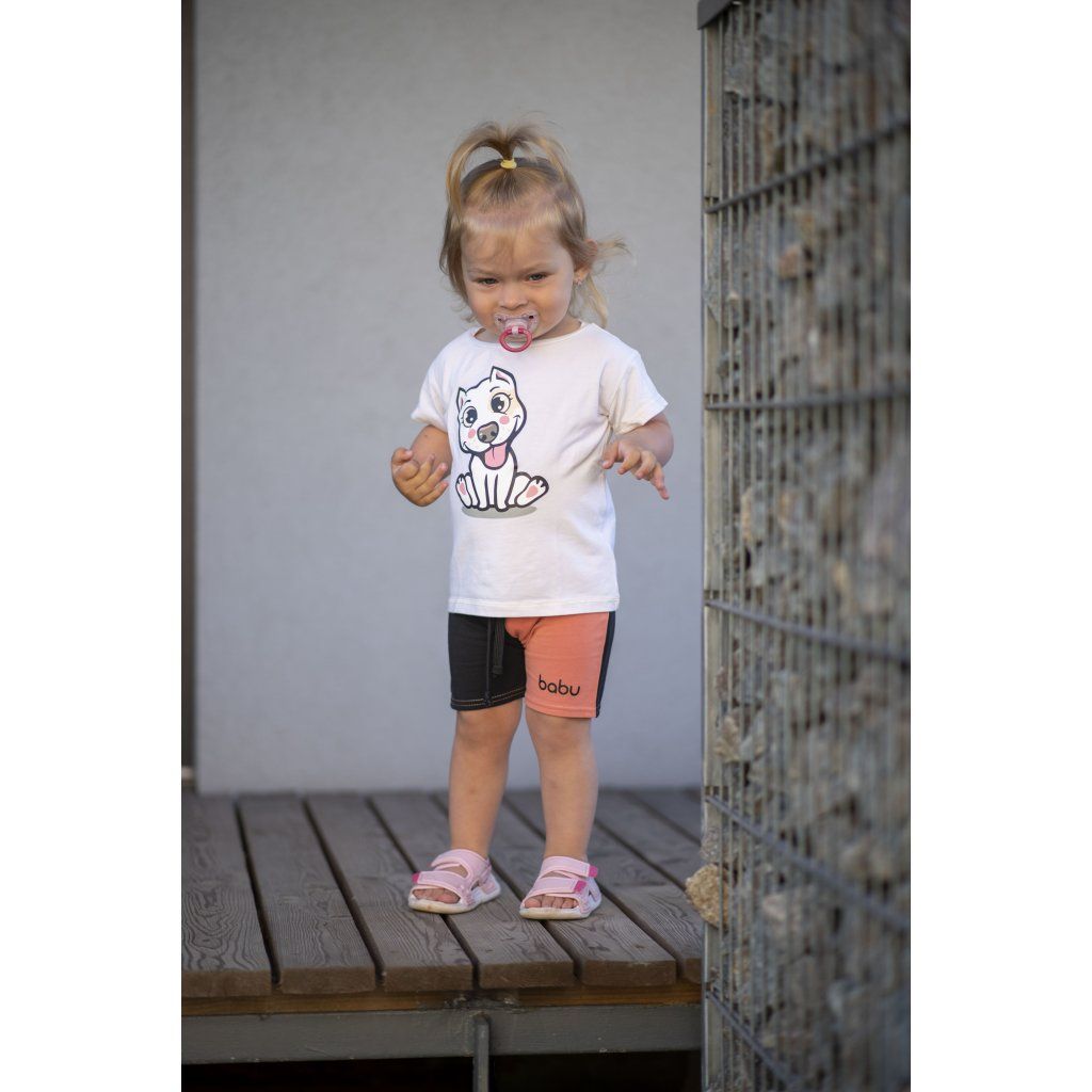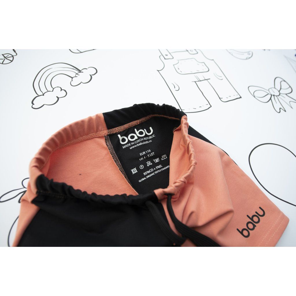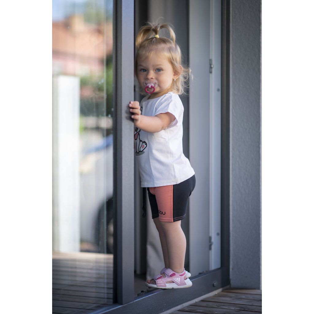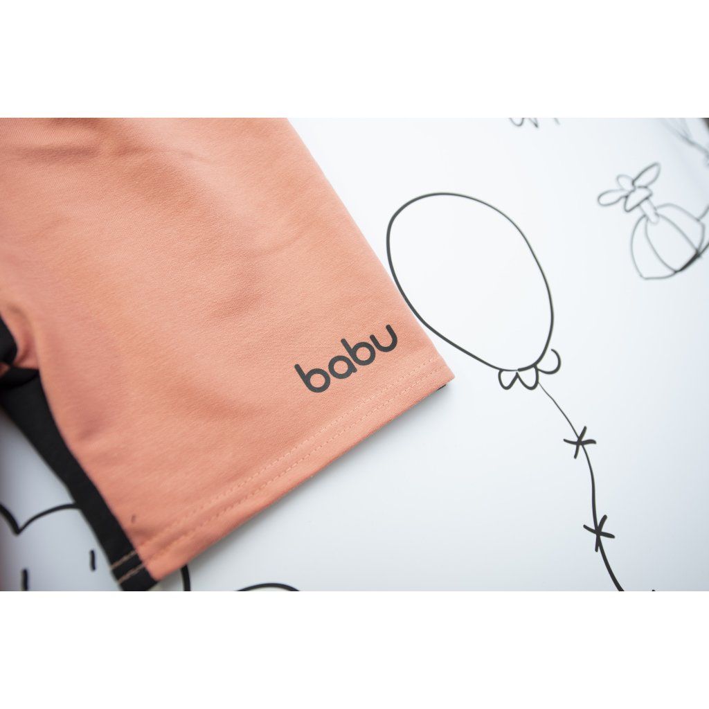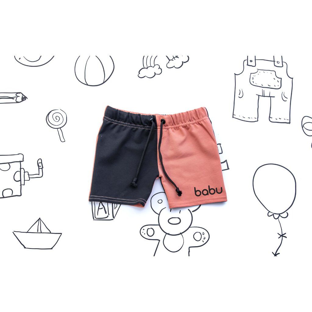 Cikcak kraťasy z bio bavlněné nepočesané teplákoviny GOTS. Kombinace lososové a černé barvy doplňuje pohodlný střih.  Bezcedulkové oblečení.